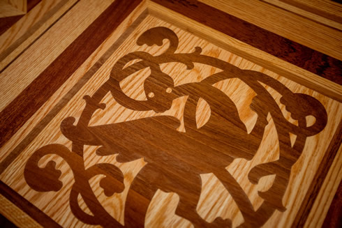 A rendkívül összetett intarziás padló fő motívuma a sárkányforma, az elemek minden anyaga hármas: vörös tölgy, fekete dió és dél-amerikai mahagóni. A parkettát a terem széleinél a falburkolat alá befutó, geometrikus mintájú díszcsík kíséri.