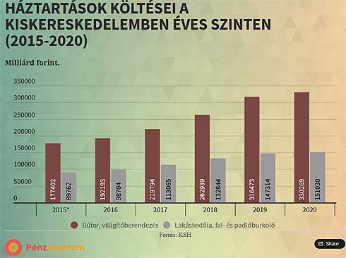Ez talán így nem tűnik jelentős emelkedésnek, de ha megnézzük forintban is, azt láthatjuk, hogy 2016-ban még bútorra, világításra 192 milliárd 193 millió forint volt az éves forgalom a kiskereskedelemben, tavaly már 330 milliárd 269 millió forint! A lakástextíliákra, burkolatra fordított költések pedig 98,7 milliárdról 151 milliárd forintra nőttek.