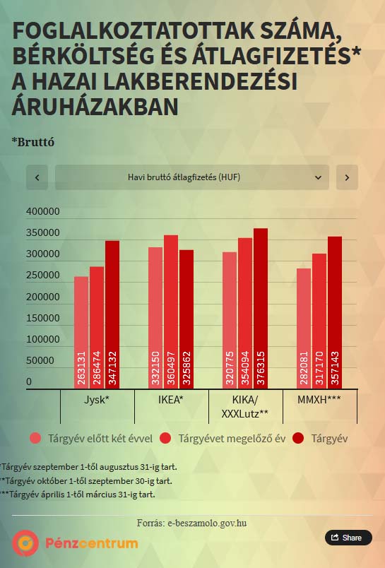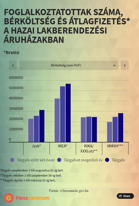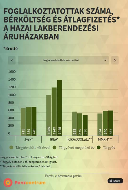 A lakberendezési áruházak között kiélezett verseny folyik a hazai bútorpiacért és a vásárlók kegyeiért. Korábbi cikkünkben elemztük, hogy alakul a legfrissebb cégbeszámolók alapján az IKEA, JYSK, Mömax-Möbelix (MMXH) és a Kikát kivásárló XXXLutz versenye, most viszont azt vizsgáljuk, hány főt foglalkoztatnak, és a bevalott bérköltség alapján mennyi az átlagos fizetés az áruházakban. Egészen más kép rajzolódott ki, mint a piaci verseny során.