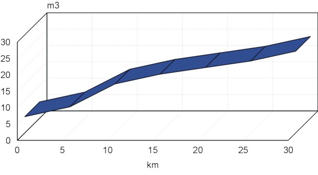 17.ábra Napi felfűrészelendő mennyisége a távolság függvényében A hazai vállalkozók kezdeti sikerei biztatóak, melyet főleg a méretpontossággal, a jó felületi minőséggel és az egyedi igényeknek megfelelő vágással értek el.