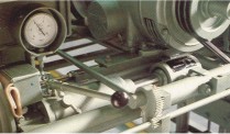 Fűrészszalag feszítés - kiegyenlítő szekrény (19. ábra bal oldali kép) A fűrészszalag feszítését hidraulikaegység végzi, rugóterhelésűkiegyenlítő szerkezet segítségével. A feszítés manométerrel igen pontosan beállítható, és az alkalmazásra kerülő fűrészszalag szélességétől és vastagságától függően szabályozható. Mechanikus rendszerűfűrészszalag-feszítőegység alkalmazható a CD5 é CD6 típuson.