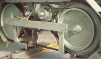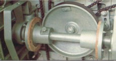 19. ábra Fűrészszalag feszítés és védőberendezés Védőberendezés (19. ábra jobb oldali kép) A védőszerkezet könnyen kezelhető védőburkolatból áll, alkalmazásával a fűrészszalag cseréje könnyen elvégezhető. A villamos meghajtású fűrészgépeken önműködő biztonsági szerkezet akadályozza meg, hogy a gépet el lehessen indítani nyitott védőburkolatnál. Előtolás (20. ábra bal oldali kép) Az előtolás és visszamenesztés súrlódótárcsás meghajtás segítségével történik ékszíj áttétellel a meghajtott szalagvezető tárcsáról kapott nyomatékkal. Az előtolási sebesség a vezérlőkar lenyomásával arányos (0-60 m/min). Fűrészszalag vezetés A fűrészszalagot két rögzített helyzetűvagy mozgatható vezetőelem vezeti meg, mechanikus szabályozással. Meghajtás Diesel motor esetén 57 Le teljesítményűDeutz motor hajtja meg a fűszészgépet. Beállítható szalagvezető tárcsa 2 db A 2 szalagvezető tárcsa öntöttvasból készült, 1m vagy 1,25 m átmérővel, kiviteli változat szerint, amelyek kúpgörgős csapágyakon futnak, beállíthatóak, dinamikusan tömegkiegyenlítettek 1 grammnyi pontossággal. A tárcsák futófelülete 2/5-ös arányban kúposra domborított. Csavarkulcs segítségével változtatható a dőlésszög. Vastagság állítás A fűrészelési vastagság beállítása skálaosztásos kézikerékkel történik, a kerék egy körülfordítása 1 cm-nek felel meg, egy tizedes körülforgatása pedig 1 mm-nek. Középen automatikus rögzítőkar található. Választás szerint lehetőség van elektromos rendszerűméretállításra is.